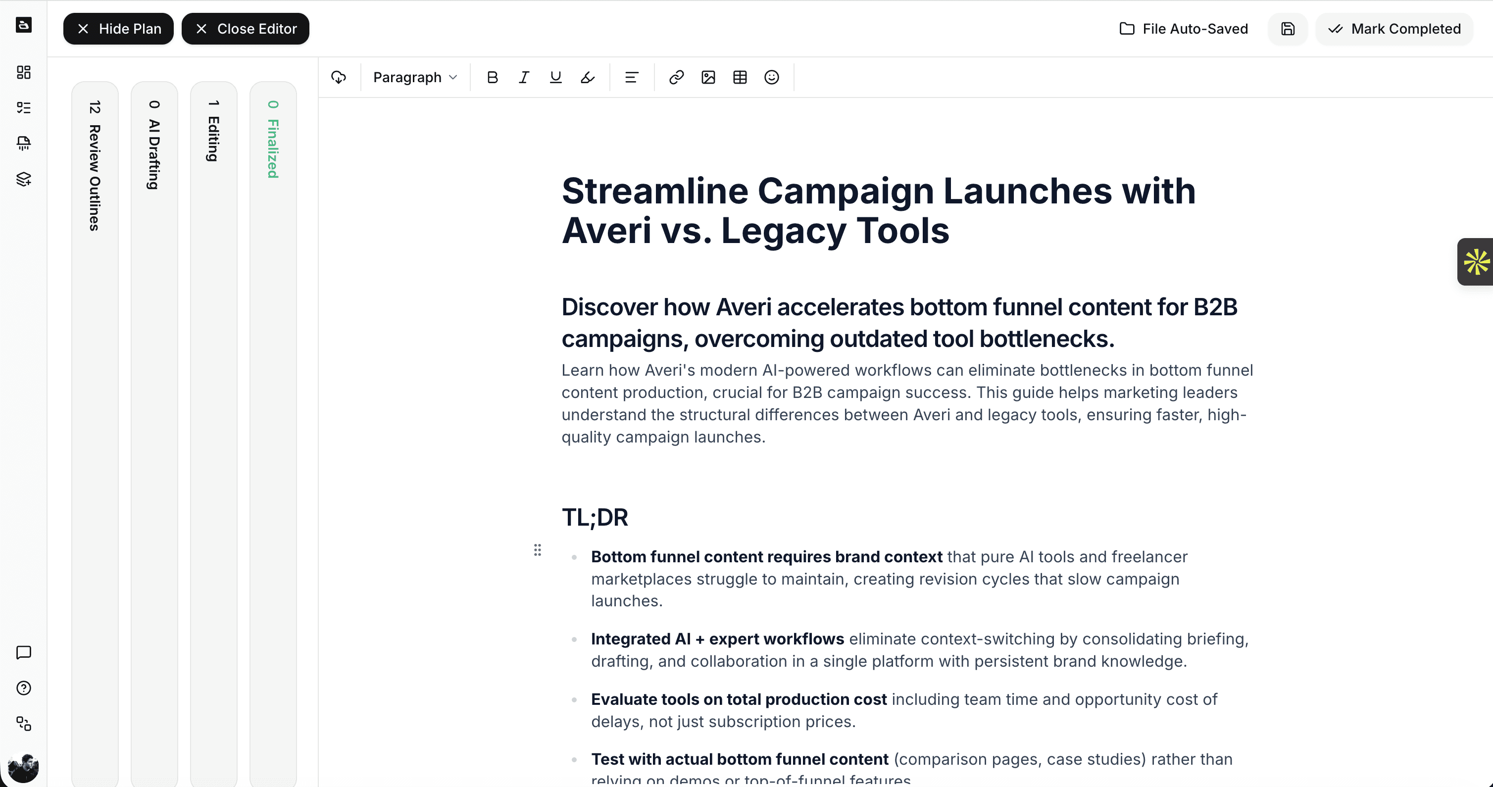 Highlight any section and ask Averi to rewrite, expand, or adjust. Tag teammates for review. Leave comments on specific paragraphs. Add the customer stories, the contrarian perspectives, the industry-specific insights that turn algorithmically optimized structure into content people actually want to read.