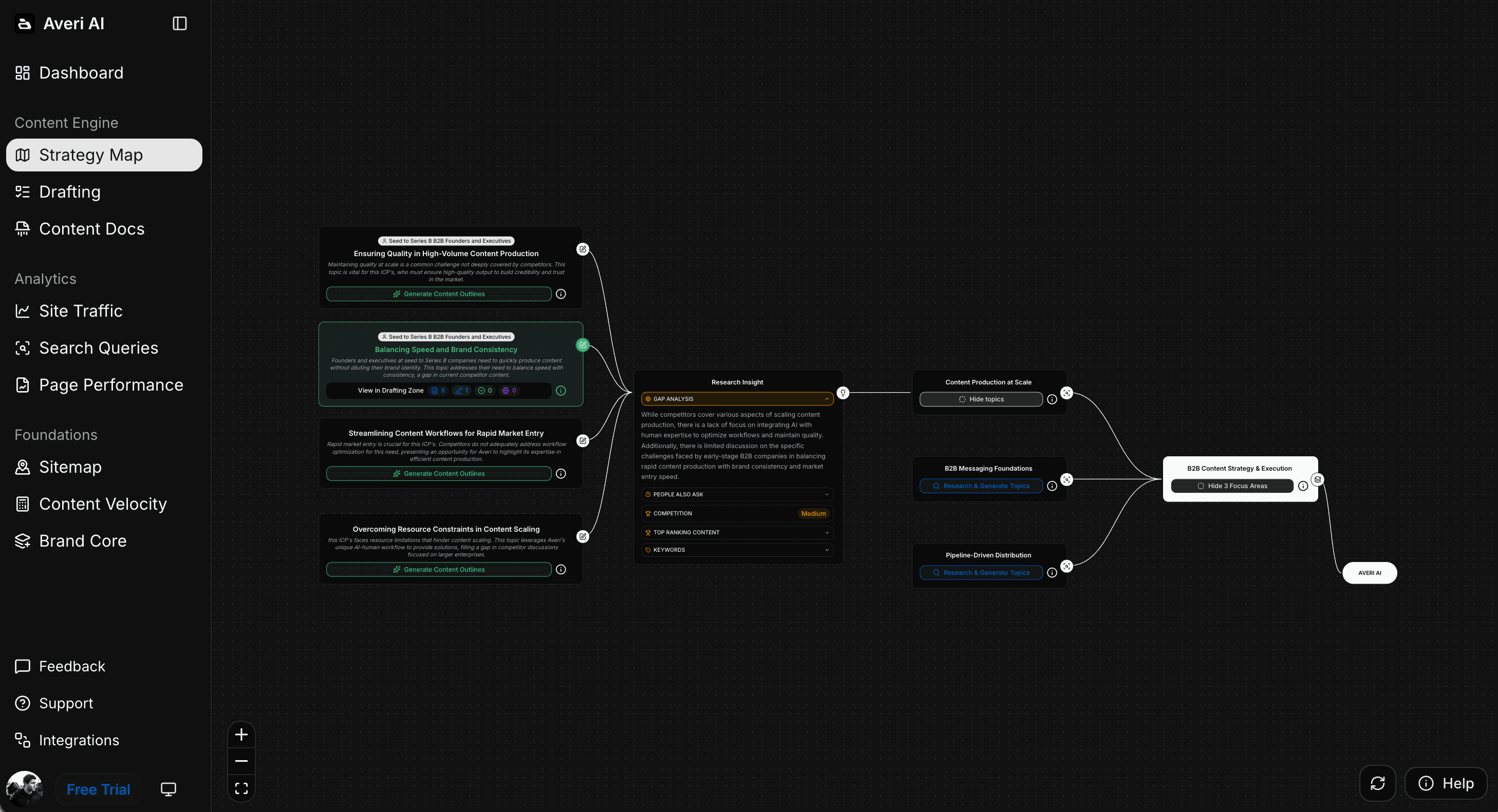 After Brand Core captures your brand intelligence during onboarding, Averi generates a visual Strategy Map organized into pillars, focus areas, and topics. This isn't a static document — it's an active framework that the AI references when generating content recommendations.