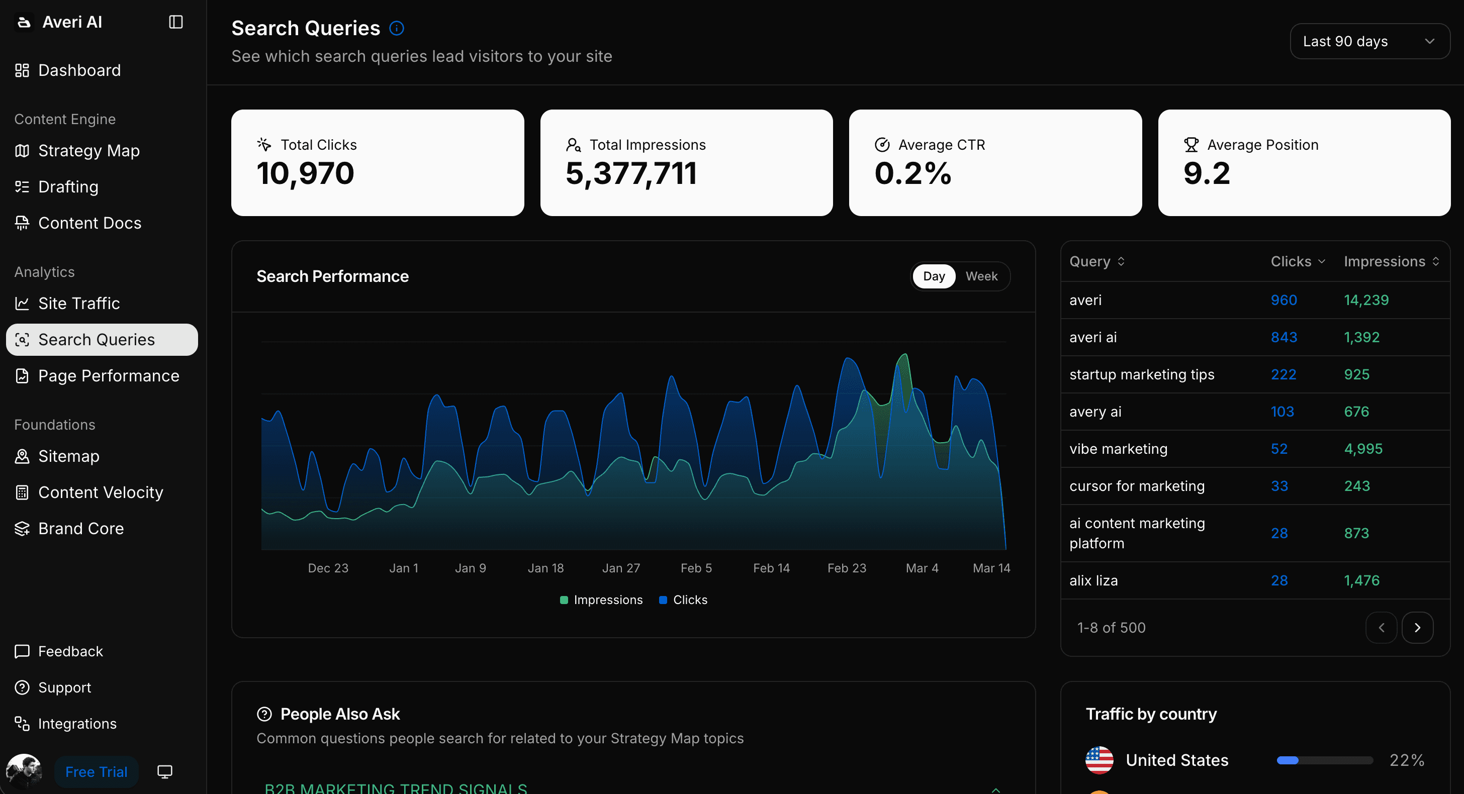 In Averi, the queue refreshes continuously as new signals come in — competitor publications, trending topics, search data shifts, and your own performance feedback. You always have a current pipeline of validated opportunities rather than a stale calendar that aged out weeks ago.