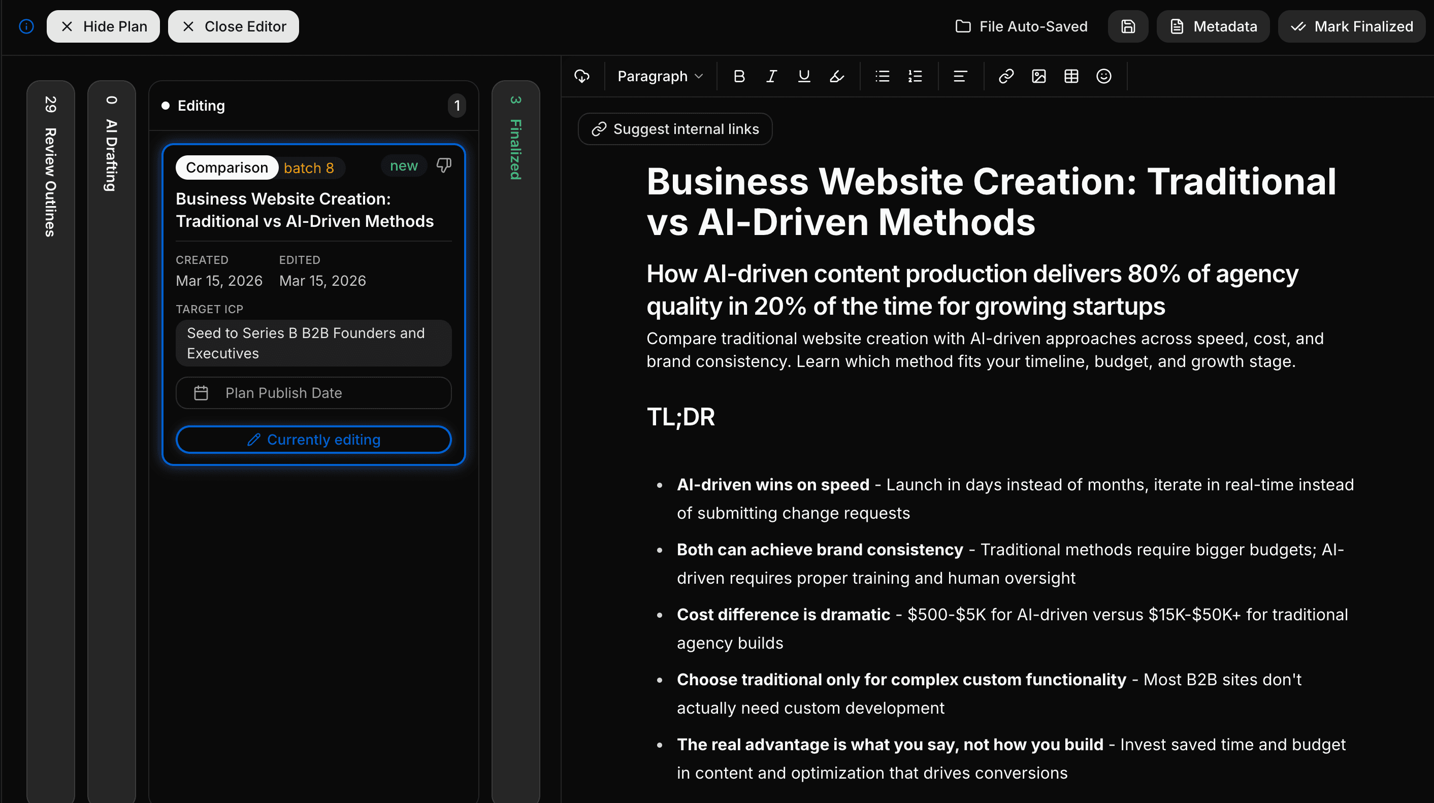 In traditional planning, the person choosing topics and the person (or AI) creating content operate in different workflows, often different tools, sometimes different weeks. The strategist creates a spreadsheet of topics with target keywords. The writer opens a blank document and tries to reconstruct the strategic intent from a one-line brief.