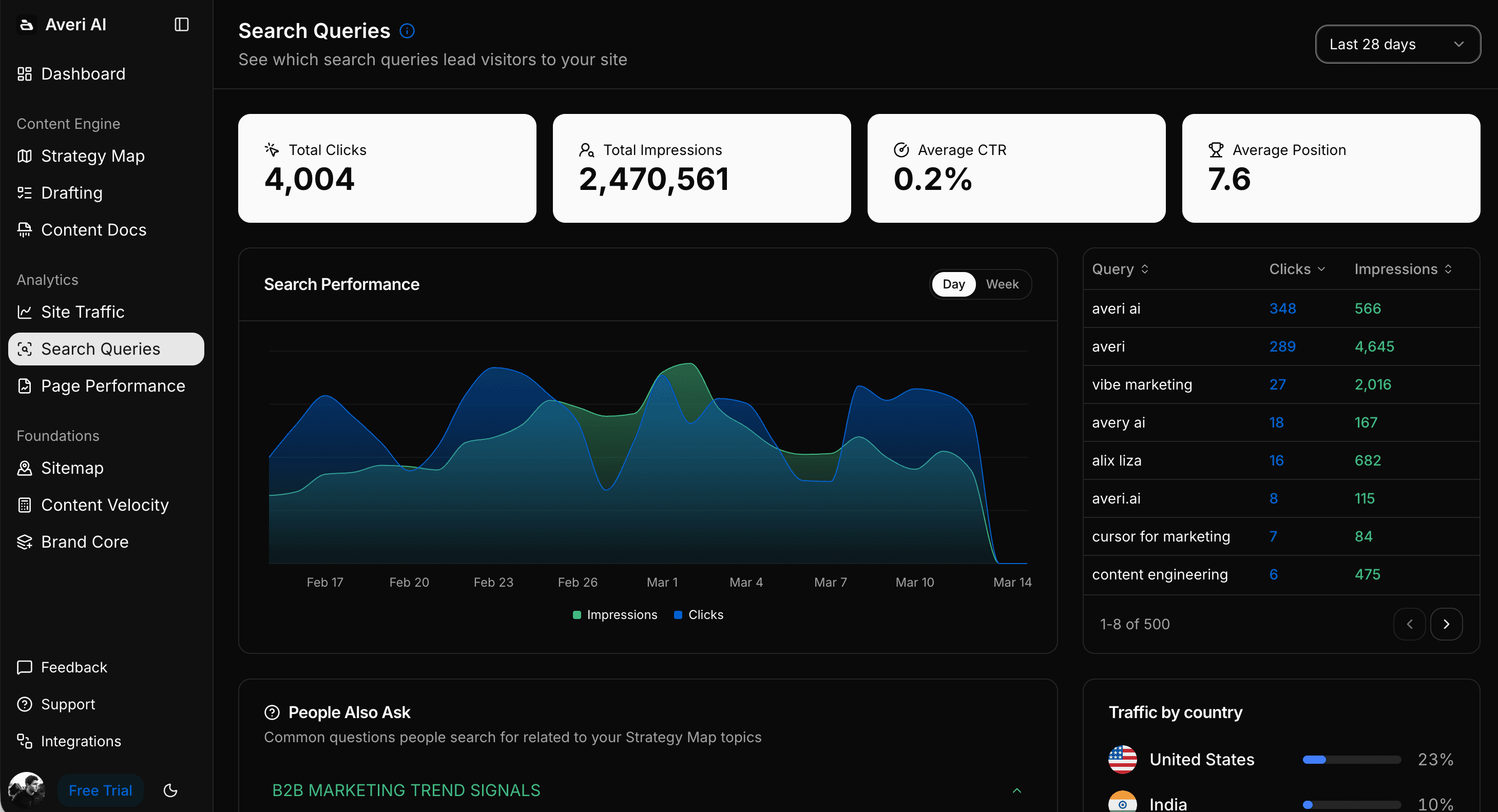 Which articles are ranking on page 2 and could be pushed to page 1 with a refresh? Which topics are trending in your niche that you haven't covered? Which competitors just published something you should respond to? Which keywords are driving traffic but not conversions — and what does that tell you about content-market fit?