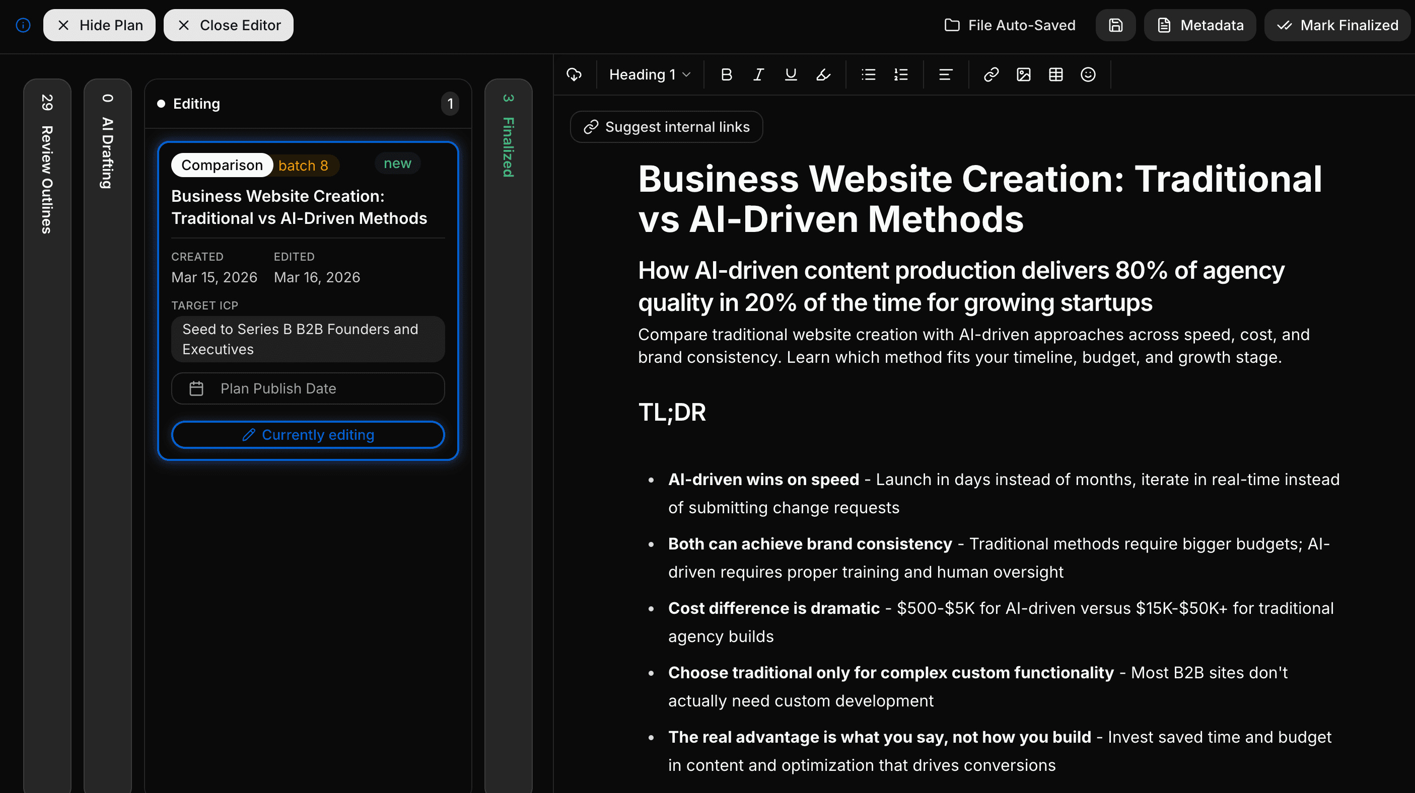 Averi's creation workflow handles deep research (with hyperlinked sources), AI draft generation structured for SEO + GEO, and a collaborative editing canvas where humans refine voice, add perspective, and ensure quality. AI Assist lets you highlight any section and rewrite, expand, or adjust tone — with full brand context loaded. Internal linking is suggested and inserted automatically. Meta tags are generated from the content itself.